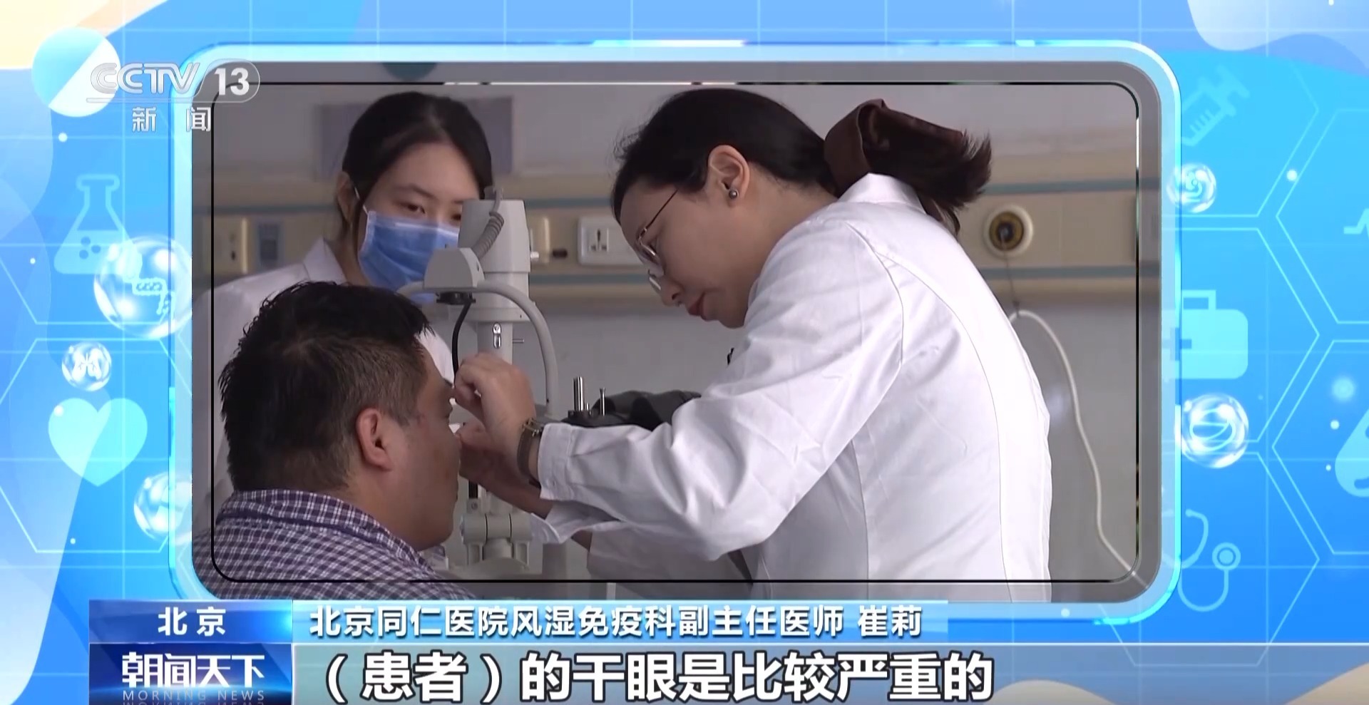 崔莉:患者的干眼症比较严重,没有泪液分泌。口干会导致您进食时无法吞咽。如果没有唾液的滋养,牙齿常常会发生龋齿。