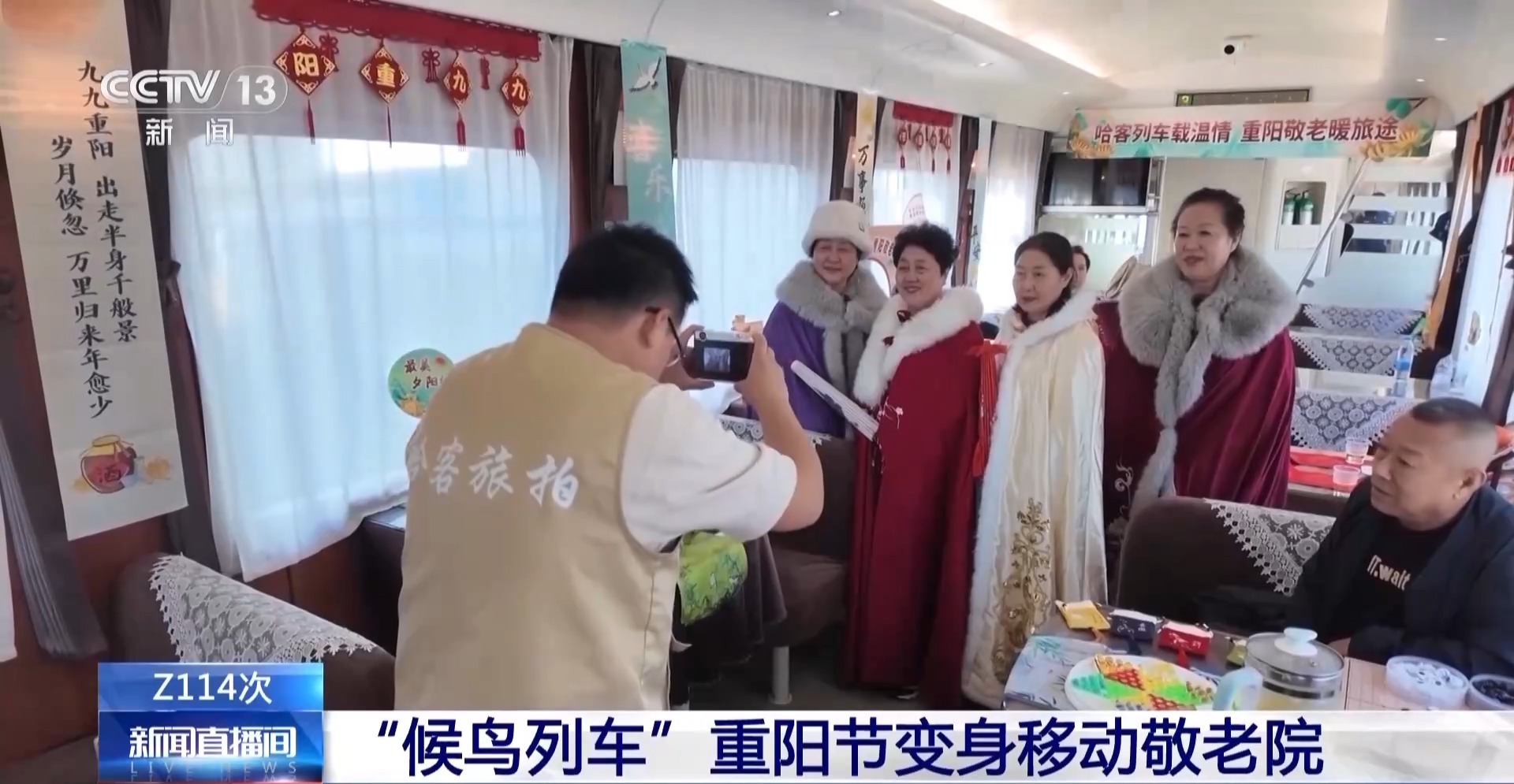 哈尔滨开往海口的列车上,一场“暖爱·重阳庆”主题活动,将快速车厢变成了敬老的温馨空间。