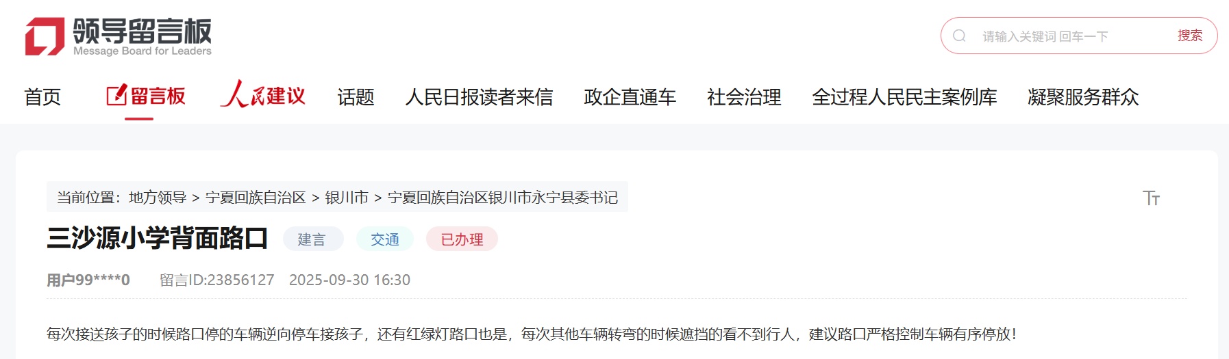 有回声丨网友举报学校门前乱停汽车。宁夏永宁