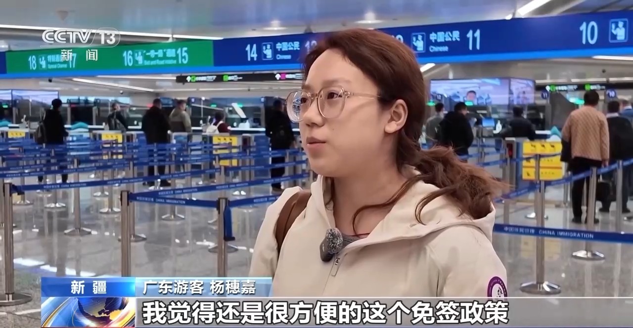 新疆乌鲁木齐出入境检验站执勤第四队队长王伟:受免签效应带动,今年斯卡、飞狮等国际航空公司进驻机场,增加了往返乌鲁木齐、哈萨克斯坦的航班数量。目前,每周往返航班数量保持在50班左右,同比增长43%。